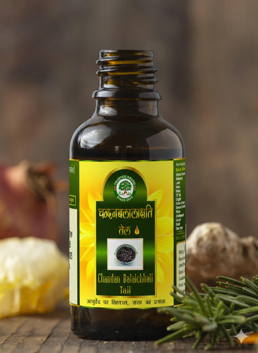 This formula combines Sandalwood (Chandan), Bala, Laxadi and other herbs in an oil medium. It is designed to cool internal heat, nourish muscles and nerves, support skin strength and soothe dryness or heat-aggravated conditions.