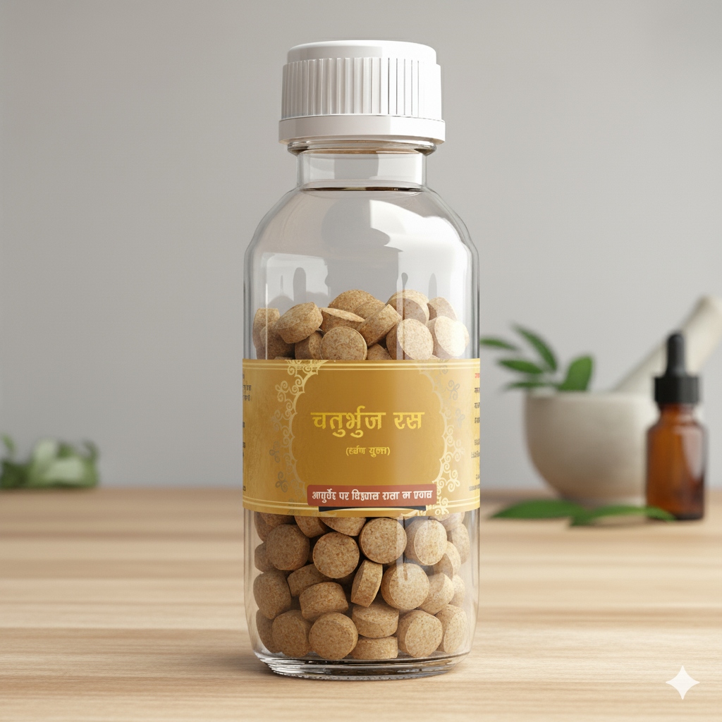 Chaturbhuj Ras (S.Y.) is a powerful herb-mineral Ayurvedic formulation combining metals and rejuvenative herbs, traditionally used to support the nervous system, chronic fevers, blood health and overall vitality.