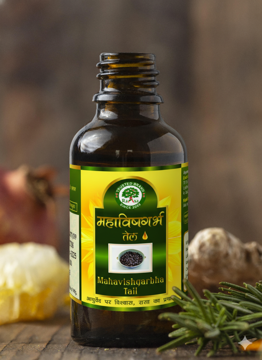 Mahavishgarbha Taila is a potent medicated oil prepared with sesame oil infused with a rich decoction of herbs such as Nirgundi, Ashwagandha, Dasamoola and Eranda.