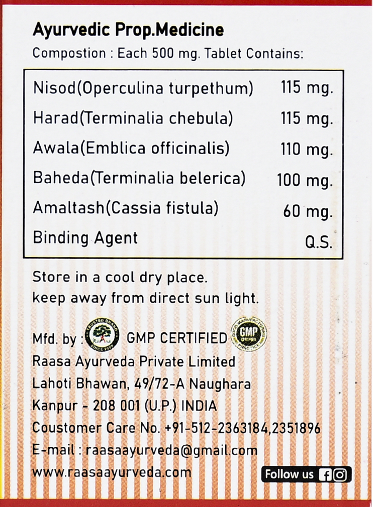 Ayurvedic Digestive Health Tablets For Acidity, Constipation & Loss of Appetite | With Harad, Nisoth, Awala, Baheda & Amaltash