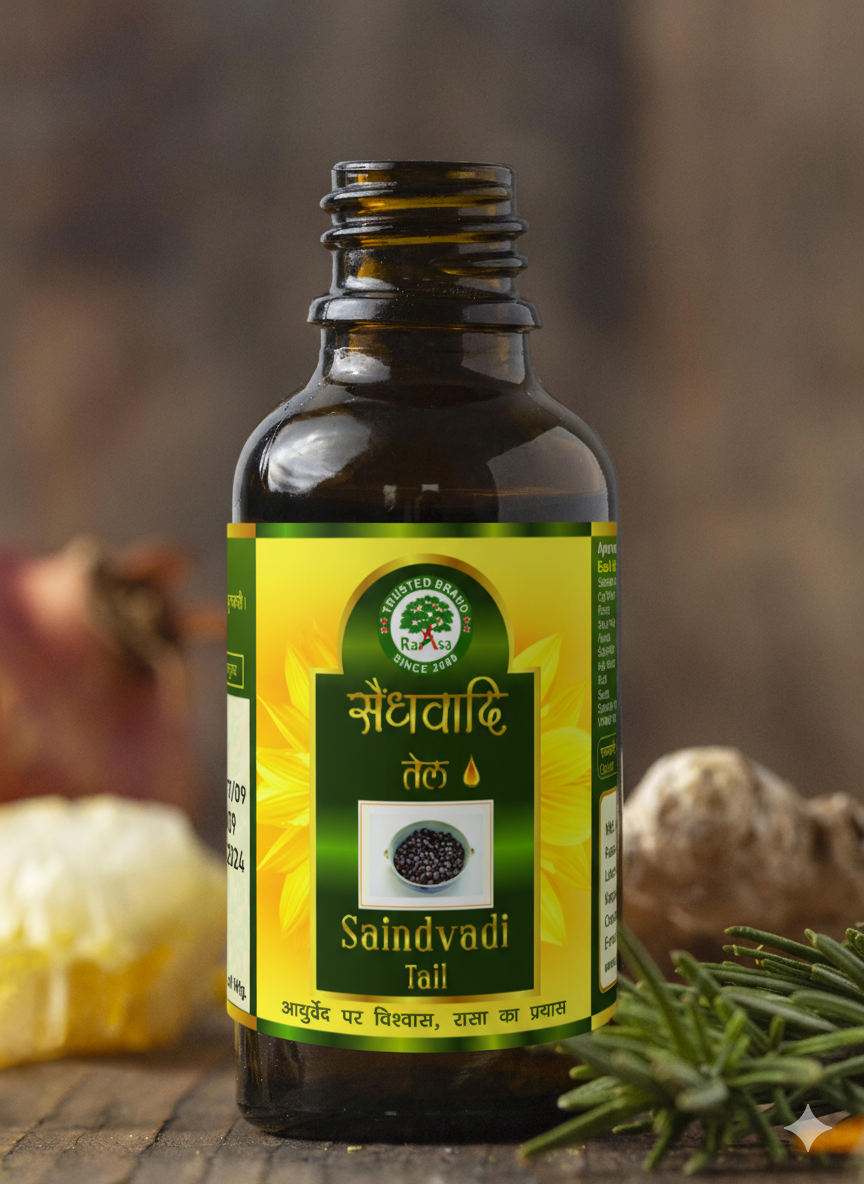 This oil is enriched with Saindhav (rock salt/mineral base) and herbs in an oil medium, used for skin nourishment, improving local circulation, soothing heat sensation in joints and supporting resilience of superficial tissues.