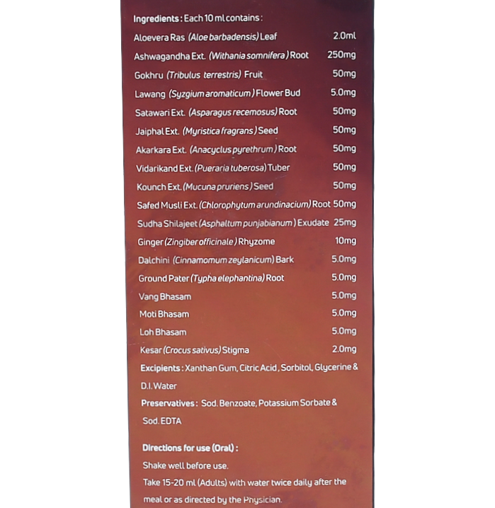 The formulation includes high-potency herbs such as Aloe Vera Ras (for nourishment), Ashwagandha (for stress resilience), Gokhru (for strength), Safed Musli, Mucuna (Kaunch Beej), Vidarikand, Shatavari, Jaiphal, and Shilajit — all known in Ayurveda for their potential to boost vitality and sexual health.